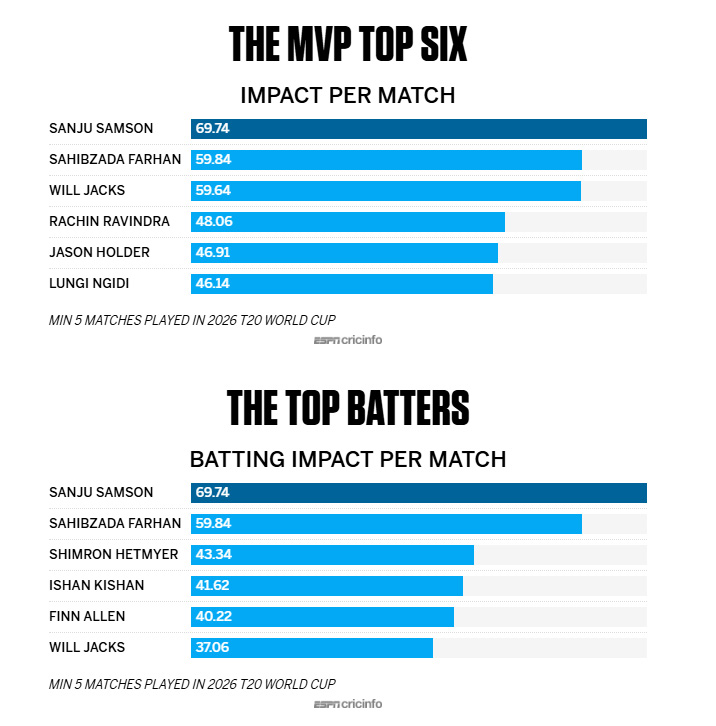 ഇതിന്റെ ഫലം തുടര്ച്ചയായ മൂന്ന് മിന്നും പ്രകടനങ്ങളായിരുന്നു. ടി20 ലോകകപ്പിന്റെ സെമി ഫൈനലിലും ഫൈനലിലും 80-ന് മുകളില് സ്കോര് ചെയ്യുന്ന ആദ്യ ബാറ്ററായി അദ്ദേഹം മാറി. പ്ലെയര് ഓഫ് ദി ടൂര്ണമെന്റ് അവാര്ഡ് അനിവാര്യമായിരുന്നു. സമ്മര്ദ്ദ ഘട്ടങ്ങളിലെ പ്രകടനങ്ങളെ വിലയിരുത്തുന്ന ക്രിക്ക്ഇന്ഫോയുടെ സ്മാര്ട്ട് സ്റ്റാറ്റ്സ് (Smart Stats) പ്രകാരമുള്ള എംവിപി (MVP) അവാര്ഡും അദ്ദേഹത്തിന് തന്നെ ലഭിച്ചു. ഈ കണക്കുകള് പ്രകാരം, ഒരു മത്സരത്തിലെ സഞ്ജുവിന്റെ ഇംപാക്ട് നമ്പര് ബാറ്റര്മാരില് മാത്രമല്ല, അഞ്ച് മത്സരങ്ങളെങ്കിലും കളിച്ച എല്ലാ താരങ്ങളിലും വച്ച് ഏറ്റവും ഉയര്ന്നതാണ്. അദ്ദേഹത്തിന്റെ ഇംപാക്ട് തൊട്ടുപിന്നിലുള്ളവരേക്കാള് ബഹുദൂരം മുന്നിലാണ്. ഈ സ്ഥിതിവിവരക്കണക്കുകള് നോക്കുമ്പോള് അത് എന്തുകൊണ്ടാണെന്ന് മനസ്സിലാക്കാന് പ്രയാസമില്ല.