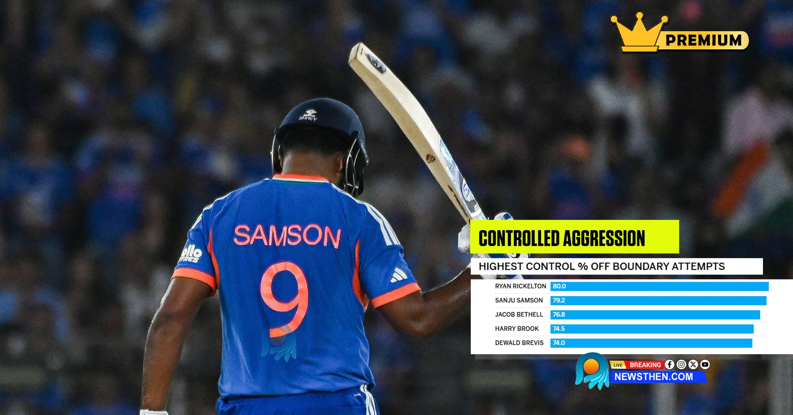 ടൂര്ണമെന്റില് കുറഞ്ഞത് 125 പന്തുകള് നേരിട്ട ബാറ്റര്മാരില് റയാന് റിക്കല്ട്ടണിന് (80%) മാത്രമാണ് ഇതിലും ഉയര്ന്ന കണ്ട്രോള് ശതമാനം ഉണ്ടായിരുന്നത്. എന്നിരുന്നാലും, റിക്കല്ട്ടന്റെ ഇന്റന്റ് ശതമാനം 37.3 ആയിരുന്നു, ഇത് സഞ്ജുവിനേക്കാള് ഏറെ താഴെയാണ്. ഇഷാന് കിഷന്റെ ഇന്റന്റ് 52.44% ആയിരുന്നു (എല്ലാ ബാറ്റര്മാരിലും ഏറ്റവും ഉയര്ന്നത്), എന്നാല് ബൗണ്ടറികള്ക്ക് ശ്രമിക്കുമ്പോള് അദ്ദേഹത്തിന്റെ കണ്ട്രോള് ശതമാനം 67.44% മാത്രമായിരുന്നു.