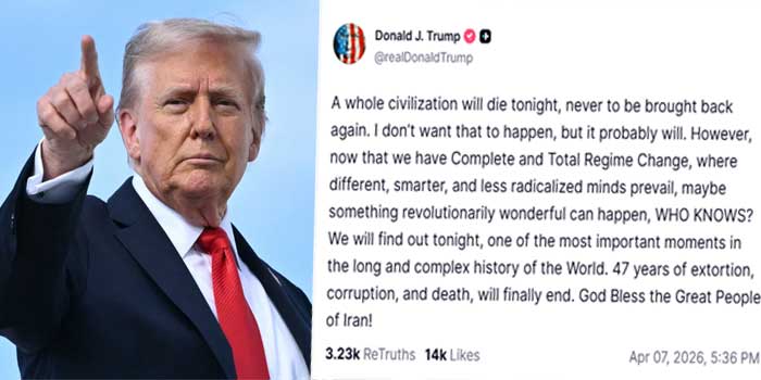 ട്രൂത്ത് പോസ്റ്റിൽ ട്രംപ് കുറിച്ചതിങ്ങനെ- ഇന്ന് രാത്രി മുഴുവൻ നാഗരികതയും മരിക്കും, ഇനി ഒരിക്കലും തിരിച്ചുവരാൻ കഴിയില്ല. അത് സംഭവിക്കണമെന്ന് എനിക്ക് ആഗ്രഹമില്ല, പക്ഷേ അത് സംഭവിക്കും. എന്നിരുന്നാലും, ഇപ്പോൾ നമുക്ക് സമ്പൂർണ്ണവും സമ്പൂർണ്ണവുമായ ഭരണമാറ്റം ഉണ്ട്, അവിടെ വ്യത്യസ്തവും ബുദ്ധിപരവും കുറഞ്ഞതുമായ സമൂലമായ മനസ്സുകൾ നിലനിൽക്കുന്നു, ഒരുപക്ഷേ വിപ്ലവകരമായി അത്ഭുതകരമായ എന്തെങ്കിലും സംഭവിക്കാം, ആർക്കറിയാം? ലോകത്തിന്റെ ദീർഘവും സങ്കീർണ്ണവുമായ ചരിത്രത്തിലെ ഏറ്റവും പ്രധാനപ്പെട്ട നിമിഷങ്ങളിലൊന്ന് ഇന്ന് രാത്രി നമുക്ക് കണ്ടെത്താനാകും. 47 വർഷത്തെ കൊള്ള, അഴിമതി, മരണം എന്നിവ ഒടുവിൽ അവസാനിക്കും. ഇറാനിലെ മഹാന്മാരെ ദൈവം അനുഗ്രഹിക്കട്ടെ!